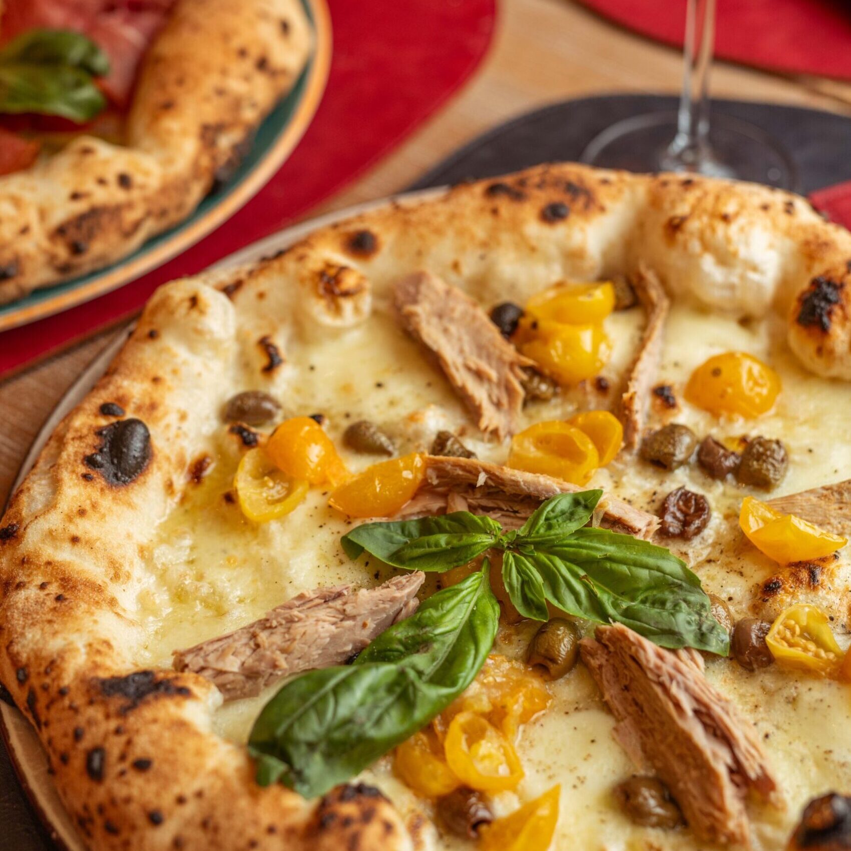 Pomodoro san Marzano DOP, fior di latte di Agerola, cipolla caramellata, tonno, olio di oliva e basilico
